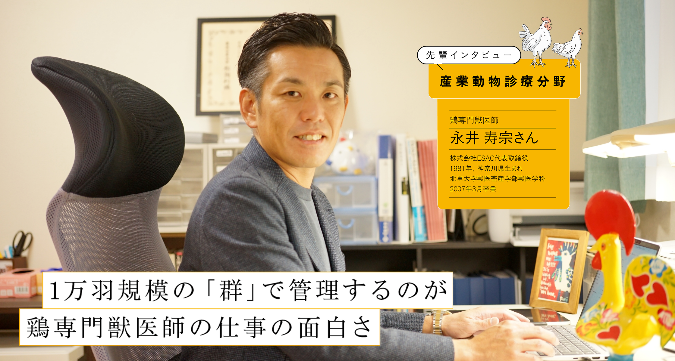 熊本県で株式会社ESACを設立し、開業医として鶏を対象にした獣医療を行っています。現在の業務は往診中心で、西日本の養鶏場を飛び回る日々です。北は茨城県、南は鹿児島県までの往診先がメインになります。規模としては、4000羽から120万羽の農場まで、実にさまざまです。最近は、養鶏の経営改善や鳥インフルエンザなど感染症予防に関する講演を頼まれることも増えています。