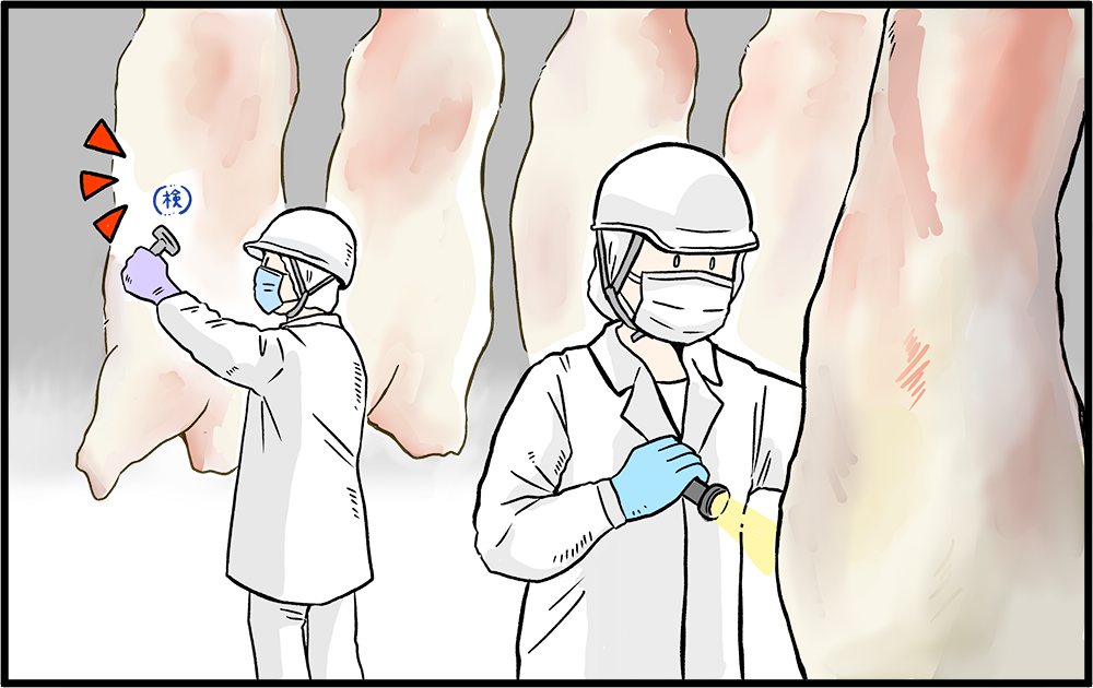 と畜検査員として働く獣医師が、と畜前の家畜の健康状態や、と畜後の血液、内臓、筋肉などをチェックして安全を確認します。異常が見つかった場合は、細菌検査、病理検査などを行います。