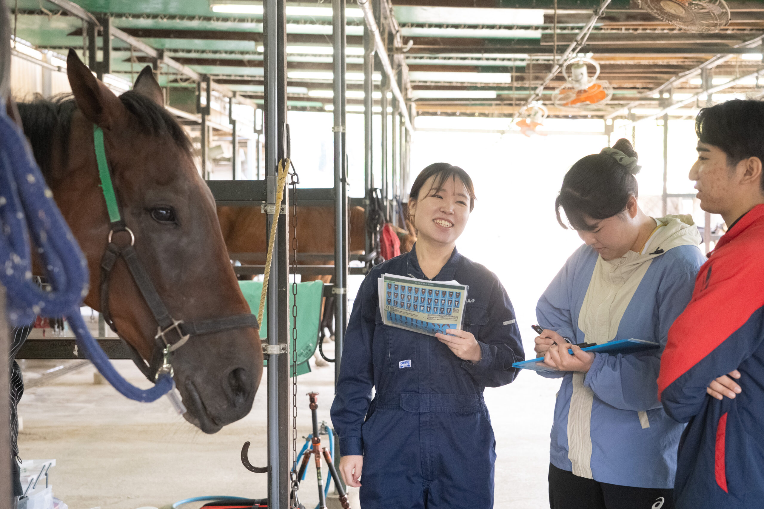 卒業後は競馬業界に就職する予定です。速いだけじゃない、ケガをしない競走馬を育てたいです。治療はもちろん、ケガをしにくい体をつくるトレーニング法の開発、ケガをしてもすぐ治せる臨床技術などの発展に貢献したいと考えています。馬の気持ちがわかると共に、馬主の意向も尊重しながら専門的な知識でアドバイスするなど、どちらも補助したい。それが難しさであり、面白さでもあると感じています。