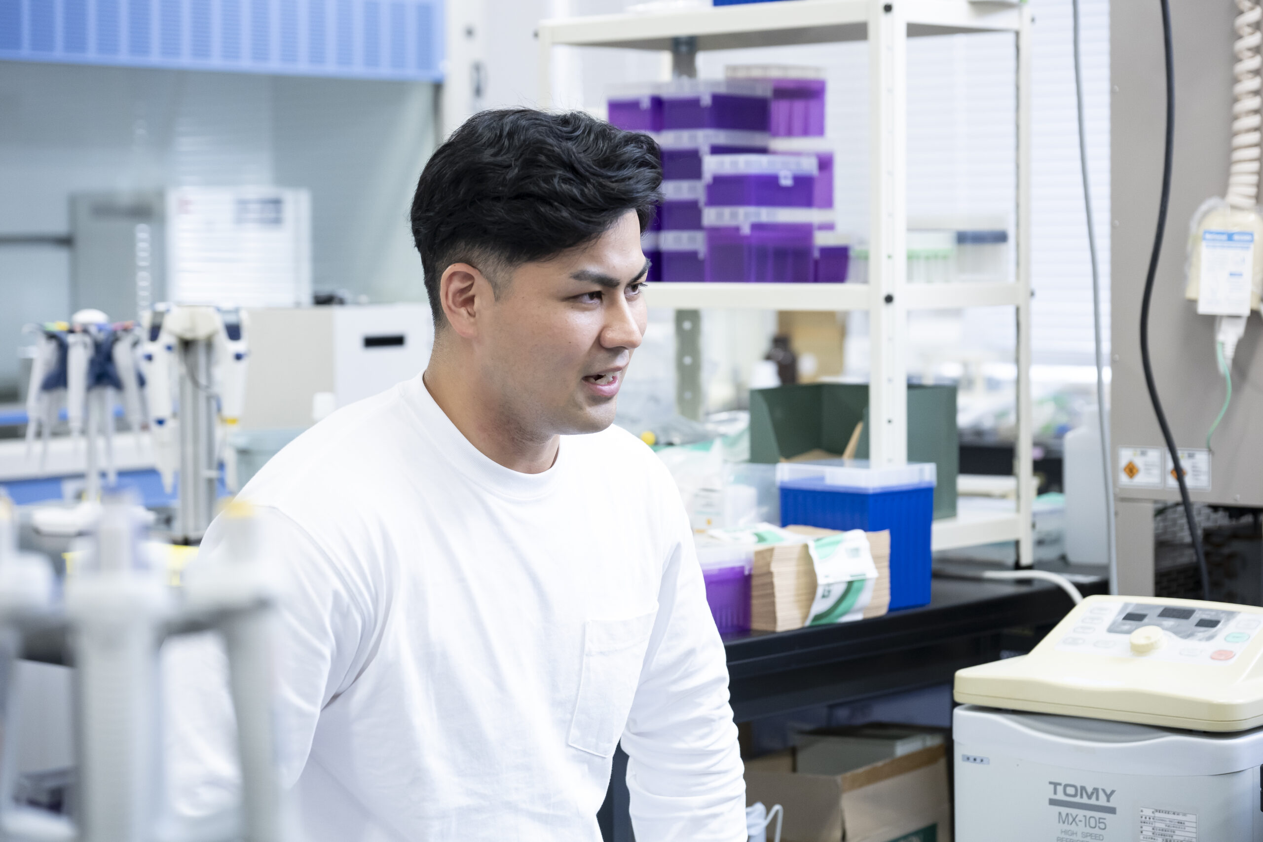 牛に多い呼吸器病についての研究を行っています。県外の農場へ出向き、牛の細胞を採集すると共に、管理状況の動画を撮影して育成状況を把握。研究成果をダイレクトに治癒につなげ、農場の生産性の向上を目指しています。