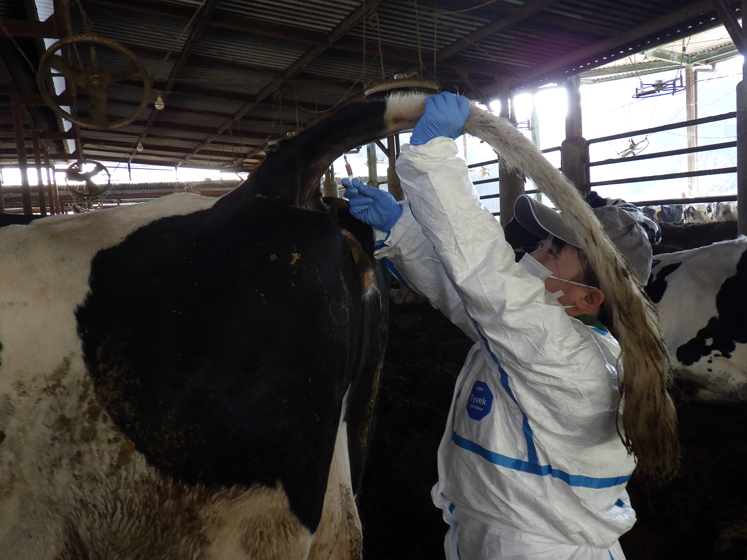検査用に乳牛の尻尾から採血をしている様子