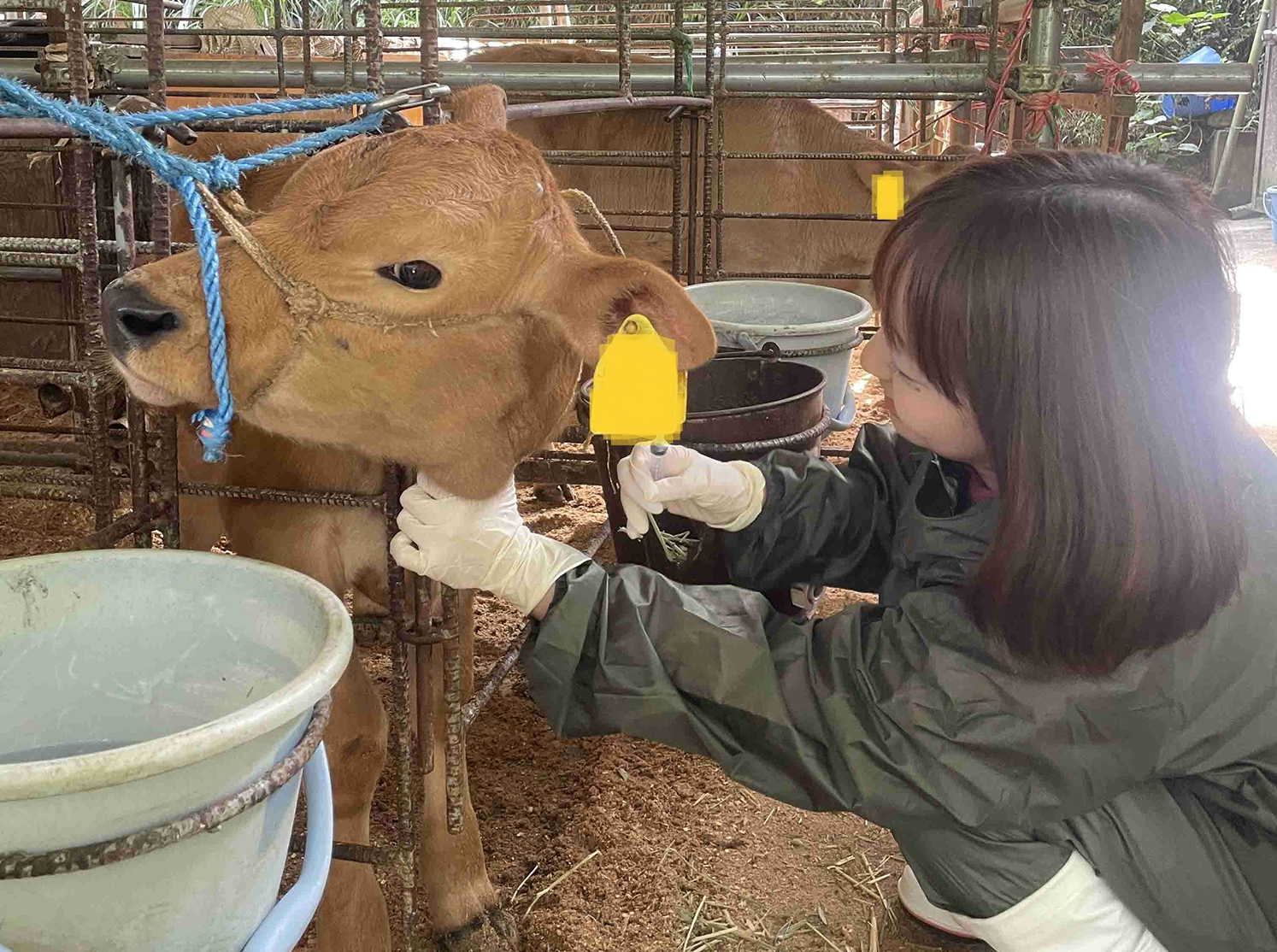 検査用に子牛の首から採血をしている様子
